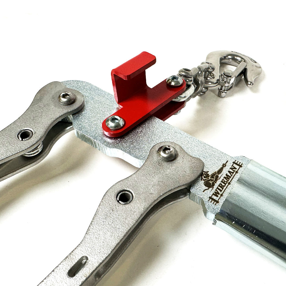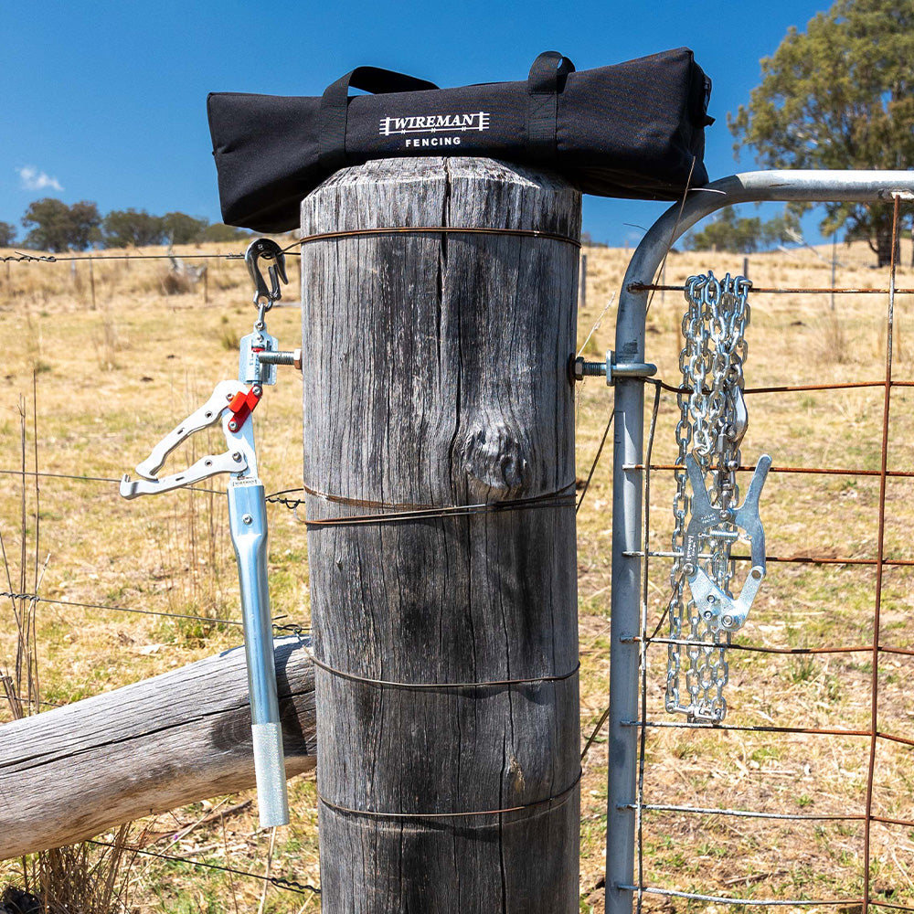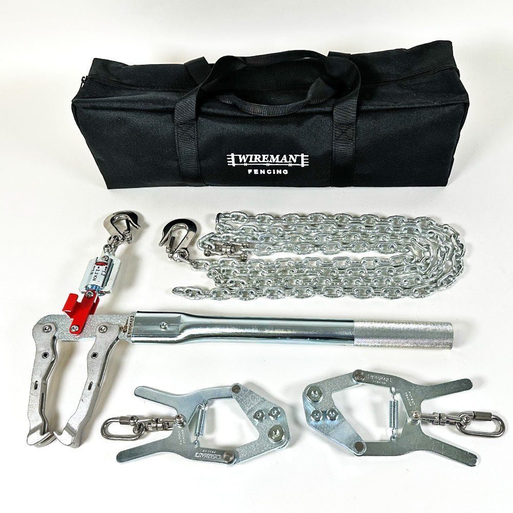Wireman wire tensioner with chain walking come along. Carry one tool for straining both plain wire and net fencing with fast and easy to use or remove, clip on parts.